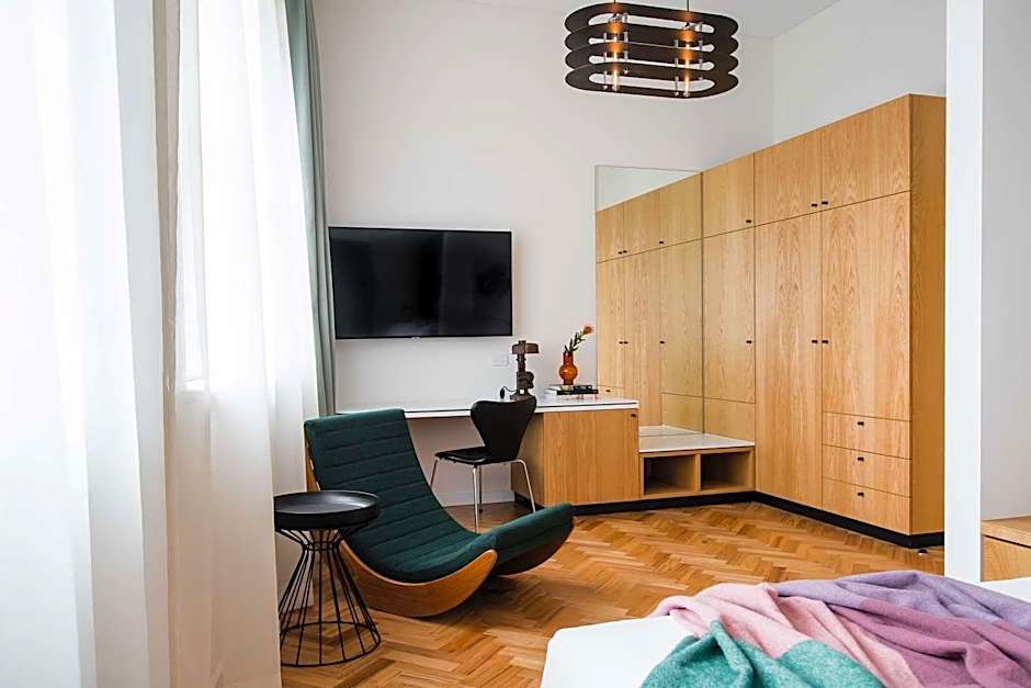 This spacious room features high ceilings and vintage, designer furniture, lamps and modern bathrooms with separate bathtub and rain shower, with dual his and hers vanities. It also includes an HD Smart TV, free toiletries, bathrobes, free WiFi and free local calls.