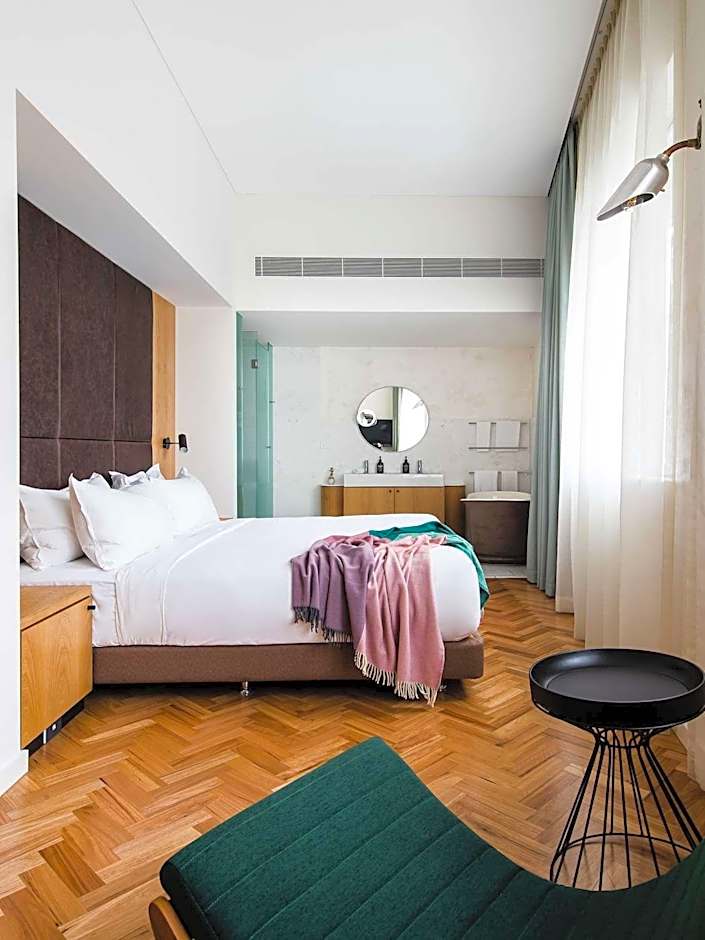 This suite is located in the former Carlton & United Breweries’ boardroom and features original timber paneling, parquetry floors, cornices and even the restored executive men's washroom. Across more than 100 square yards the C.U.B. Suite offers spacious separate sleeping quarters and ample meeting, living and dining space with an eight-seater table.